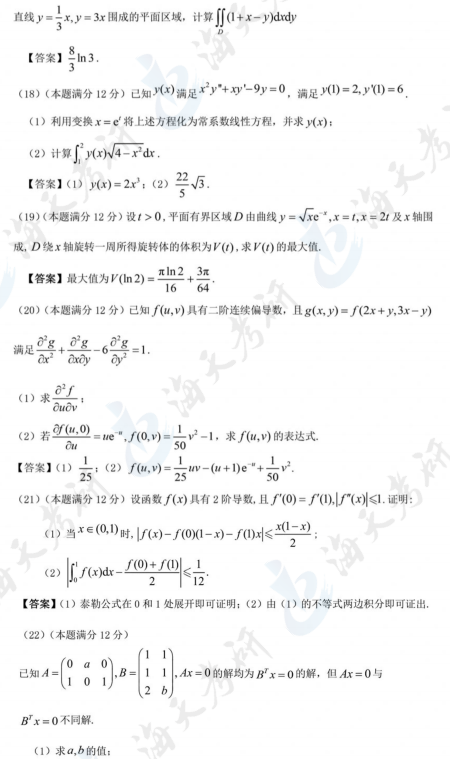 2024硕士研究生考试初试时间为12月23日-24日,在2024考研初试数学考试结束后,知道大家都在关注2024年考研真题及解析,海天考研网为各位考生带来2024考研数学二真题及解析汇总,包括考研数学二选择题、填空题和解答题3大部分,本文整理了2024全国硕士研究生招生考试数学(二)真题—解答题,各位考生可以参考估分,提前准备考研复试,助力各位考生考研备考。